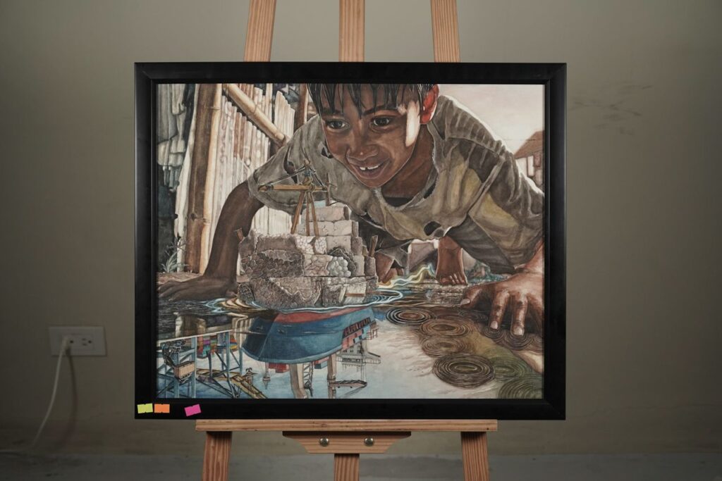 The Watercolor category’s first-place winner is “Odyssey of the Scrap Mariner” by Jonnas Almazar. It depicted a child’s imaginative transformation of scrap materials. These materials turned into a grand vessel. In second place, “Two-Big” by Irish Fernandez symbolized hope through a yellow-clad figure. The third-place winner, “Kinsesas” by Keth Byonnsey Estilo, used welding sparks. These sparks reflect a father’s love for his children.